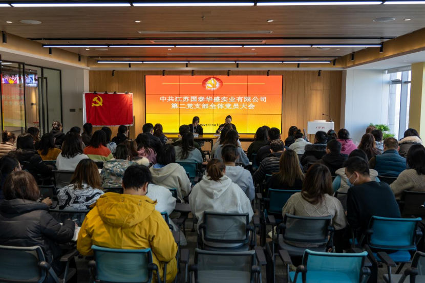 On the afternoon of December 27 the second party branch of Jiangsu Guotai Huasheng Industrial Co. Ltd. held a meeting of all party members The meeting passed the regularization application of Comrade Yang Jing and Comrade Chen Hong succe